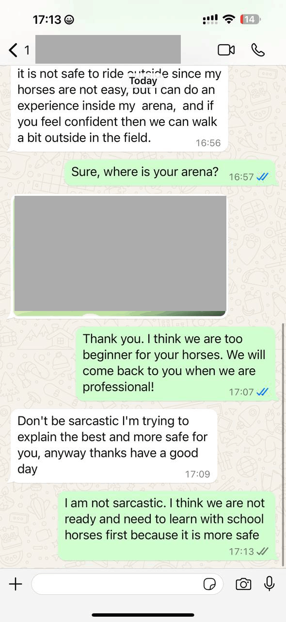 So I found another horse school in the area which was very friendly Germans who essentially said the same (the horses are pro, not for beginner) but she was very sweet and recommended other another horse company for beginners.